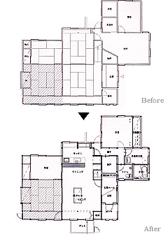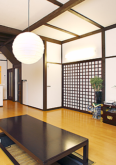 リフォームに際し、坂田さんが伊藤さんに希望したのが、生活動作が小さくてすむような家事動線とバリアフリー、犬が勝手に外に飛び出さないような建具などの工夫、そして家相や色、方角を含めた風水に合致する空間づくりでした。伊藤さんは、まず古民家の母屋に伝統的に見られる田の字型という間取りのゾーニングから始め、古民家の良さを残しながら、機能的な設備を導入。さらに、風水の方角等を書き入れた間取り図を独自に作成するなど、坂田さんの要望に合うような調整も併せて行いました。