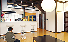 もともと人と接するのが好きで、喫茶店で働いていた事もあるという坂田さんは、子どもや孫たちやお友だちが集まる、陽光ふりそそぐ広々としたリビングダイニングにとても満足しているそうです。洋風のインテリアも好きな坂田さんにとって、子どもたちが思い思いに食べる少人数の時でもすぐに用意して食べられるようにと、キッチンの真向かいに、キッチンのデザインや色にあわせて真っ白な3脚のカウンターチェアと、ペンダントライトを設えました。また、家族一堂に会する毎日の夕食は、ダイニングの真ん中にある、8人ほど座ることのできる大きな長方形の掘りごたつを囲みます。元気な犬の3匹も加わって、とても賑やかで明るい時間を過ごすことができるようになりました。