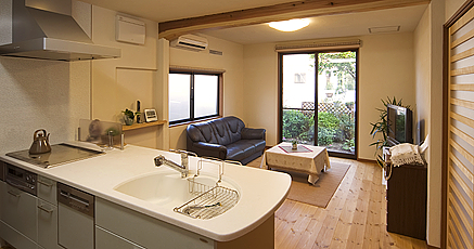 リビングのソファで寛ぐご主人や、やんちゃなお孫さん、そして四季折々の庭の植栽を見渡すことができるキッチンは、奥様のお気に入りの場所。広く、明るくなった空間で、ご家族のコミュニケーションが育まれます