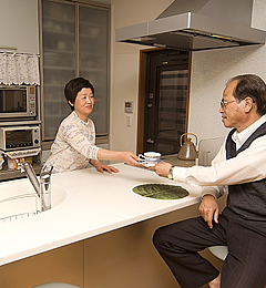 「これまではキッチンとリビングが別々の部屋にあったので、ひとりで調理して食事をリビングに運び、後片付けの際もひとりでした。いまは、できたての料理をすぐに出せますし、主人や孫と話したりテレビを見ながら作業できるので嬉しいですね。気付けば終わっているという感じです」と奥様はにっこり。食器洗い乾燥機やIHクッキングヒーターの使い心地にも大満足で、料理をするのが一層楽しくなったといいます。