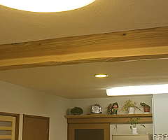 天井には、補強も兼ねて杉の丸太を嵌め込みました。風合いのある木目が、空間のアクセントになっています。リビングや玄関のニッチにも同じ丸太から割った杉の木が使用されていて、飾り棚として活躍中。格子が嵌め込まれた、和の趣が漂う玄関ドアやリビング・ダイニングの引き戸が、木の空間と見事に調和しています。家具の制作・販売も行っている木楽だからこそ、住まいのコーディネートはお手のもの。照明やインテリア、カーテンのセレクトも、同社が担当しました。
