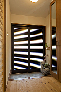 暗くて狭かった玄関は、引き戸に変えてすっきりと。格子の間から、外の光が射し込みます。採光を確保するためのアイデア