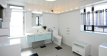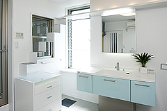 空間の主役となる洗面化粧台には、Kさんがショールームでご覧になって一目惚れしたヤマハの「アフェット・f」を採用。アクアグリーンのカラーがKさんの好きな色であったことと、カウンターと同素材の人造大理石を使った光沢のある一体型の洗面ボウルがしっかり心をキャッチしました。一体型の洗面ボウルは、いつも清潔でお手入れも簡単。収納も豊富で、使い勝手も良いそうです。