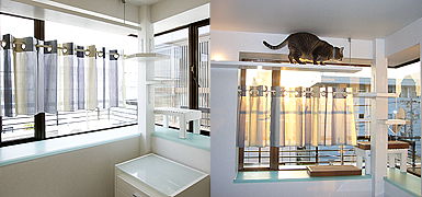 明るく陽の当たる場所が大好きな猫ちゃんは、Kさん宅の3階のペントハウス的な空間が大好き。元々そこにはバスルームとトイレ・洗面室などの水まわり空間と箱庭がありましたが、3階で高さがあるため、外に飛び出したら危ないのでKさんは心配でした。そこで、お風呂好きで、サウナ好きでもある猫ちゃんのために、外に出ないでも、明るくて風が入って、部屋の中で遊べる猫ちゃん用のプレイルームを兼ねたパウダールームにリフォームしました。