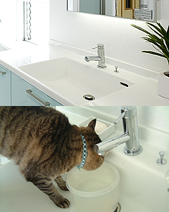 カウンターと一体型の洗面ボウルは「アフェット・f」の特徴。容器に水を溜めておくと、猫ちゃんが自分で飲みに来るのだとか