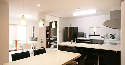 白を基調とした空間に、ヤマハシステムキッチン「berry」Gシリーズのダークシカモア色のキッチンを中心としてシックで落ちついた雰囲気に