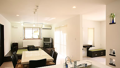 南側に大きく採られた窓からそそぐ陽光が白の空間に映え、清潔感と開放感を生み出している。家族の団らんは奥のテレビ前の畳の間で