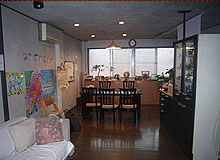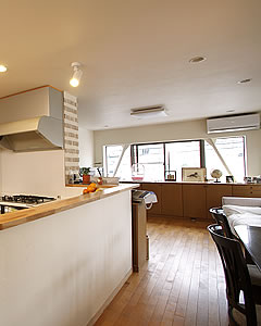 以前はキッチンがフロアの一番奥の、窓がある壁側に配置されていました。そのためにダイニングを背に作業をするので、後ろの様子がわかりにくいということが気になっていました。また、入口からの距離が一番遠いために動線が長いこと、キッチンが入口から全部見えることなどの問題点もありました。今回のリフォームでは、この点をふまえて間取りを全面的に変更し、キッチンは入口付近にL字型に配置し、ダイニングとリビング部分が見渡せる対面式に。また対面式で食器などのやりとりができる程度の幅を持つカウンターを設置しました。