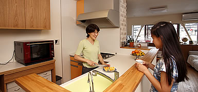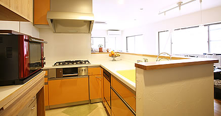 Mさんは、現在、自宅のリビングダイニングフロアの2階を開放して子ども向けの英会話教室を開いています。対面式のカウンターを挟んだダイニングテーブルで、生徒さんの様子を見守りながらキッチンに立ってお茶を入れたり、娘さんの勉強をみてあげたりしているそうです。単に食事の用意をしたり、ご飯を食べたりする場所というだけでなく、人が多くてもスムーズに動作や移動ができるようになった今回のリフォーム。アクティブなMさんご家族にとって、人が憩い集まる活き活きとした交流の場としても広がっていきそうです。
