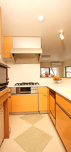 住たいる工房のスタッフがMさんご家族のライフスタイルをお聞きして強くおすすめしたのが、ヤマハのシステムキッチン。性能と価格のバランスが良くコストパフォーマンスに優れていて、シンクとカウンターが一体化した継ぎ目のない一体成形型であることをアピールしました。そこでMさんご夫婦は、フロア全体を構成するリビングタイニングとの相性や組み合わせを考えるため、ヤマハのショールームを訪れ、一度実際に見て確かめることにしました。いろいろと候補はありましたが、一体成形型設計をはじめ、デザイン性、価格などを総合的に評価してberryシリーズに決めたそうです。色も悩んだそうですが、最終的にはMさんご夫婦の娘さんがすすめてくれたハニーオレンジにしました。M邸の2階にあるリビングダイニングは、今回のリフォームで窓を大きくとり、窓の数も増やしました。陽光があたたかな色調の木の床に降り注ぎ、同じフロアにあるトイレのドアガラスから漏れる灯りがオレンジ色だったこともあって、berryシリーズのオレンジ色のキッチンがフロア全体にうまく溶け込み、統一感のある明るい空間となりました。