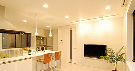 たっぷり収納で片付けのしやすいキッチンは、お手入れも簡単。家事動線が短くなり、時間にもゆとりができました。以前もヤマハのキッチンを使っていたというTさん。他のキッチンも検討しましたが、汚れがつきにくく使い勝手が良いことや、明るいLDKの雰囲気にフィットすることから、今回もヤマハのキッチンを選びました。白いインテリアの中でフレッシュなライムグリーンのシンクがアクセントとなり、明るい空間を一層際立たせています。