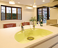 お手入れがしやすい人造大理石のシンクは、ライムグリーンをセレクト。白い空間の中で、清潔感あふれるフレッシュなアクセントとなっている。