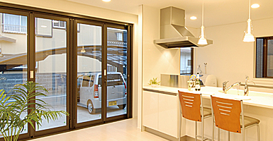 4連のオープンサッシから、床と同じ高さのデッキへ出られる。園芸をするご主人と料理をする奥様が、近い距離でお互いに存在を感じていられる。