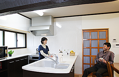 キッチンは南側の和室を取り払い、ゆったりとしたLDKに。天井には珪藻土を塗り、床は桧のフローリングで新和風スタイルです。採光用の窓を取り付け、かつては暗かった台所が光を浴びるキッチンに生まれ変わりました。キッチンが変わって大喜びなのは奥様。「すごく快適なんですよ!お料理作ろうって思いますもの!(笑)」家族から遠く、寒かった以前の台所では、“いかに早く台所から離れるか”を考えてばかりいましたが、今は家族と会話をしながら家事をすることができます。「高校生の娘も積極的に手伝ってくれるようになりました(笑)。」家族の集まる中心がキッチンになり、コミュニケーションが増えたようです。お料理がしたくなる理由は、それだけではありません。ヤマハのキッチンを入れることは最初から決めていたという奥様。「人造大理石のキッチンは、お手入れがしやすいし、汚れが目立たないし、そもそも付きにくいですね。扉の開け閉めの感覚も好きです。」と、使ってみてさらにその良さを実感したそう。