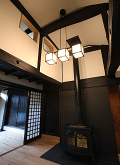 高い天井と梁を生かした結果、薪ストーブを設置。古式ゆかしいあたたかみのある空間となった。