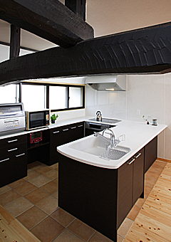 キッチンはダークチークの扉とホワイトのカウンターで、洗練された配色。年輪を刻んだ梁と、自然にマッチしている。