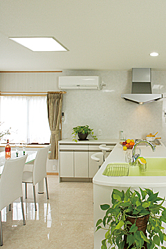 真っ白なLDKに、白い椅子やソファを置き、ライムグリーンのシンクや観葉植物がアクセントとなり、どこまでも明るく清潔な空間。