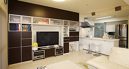 明るく開放感のある広いLDKは、用途変更可能。大画面テレビでホームシアターが楽しめ、家族の憩いの場となっている。忙しい中でも簡単に片付けができるよう、収納にもこだわった。