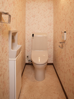 やさしく明るい雰囲気のインテリアに合わせ、トイレもエレガントな色調でまとめた。