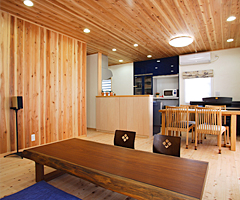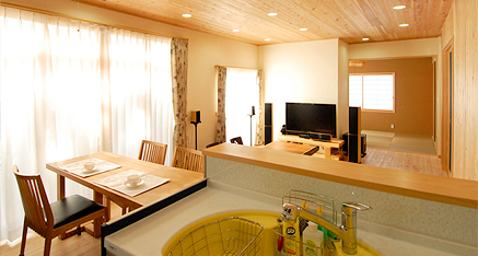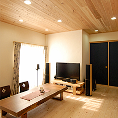 こだわったのは“和テイストの自然素材”。木の質感を存分に味わえるLDKは光に溢れ、生活にうるおいを与える大空間。ほんのり色味のあるホタテ漆喰の壁に、床は桧の無垢、天井には杉板を使用。床下と壁には断熱材を入れ、大型の窓や和室には断熱性の高いサッシを採用しました。すきま風に悩まされたリフォーム前が嘘のように、真冬でも少しの暖房であたたかく、見た目にもぬくもり感いっぱいの居心地の良い空間に生まれ変わりました。空間に合うインテリアをコーディネートするのもリフォームの楽しみの一つ。建具や家具もオリジナルで製作。自然素材をたっぷりと用い、肌触りと美しさにこだわりました。映画好きのご主人様はリフォームを機に白木調のスピーカーに買い換え、こだわり満載のホームシアターを同時に実現しました。