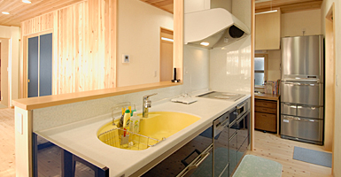 奥様お気に入りのキッチンは人造大理石のカウンター&シンク。お手入れのしやすさはもちろんの事、C(サイクロン)フードUのお手入れもらくらく。