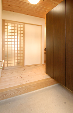 奥様のお父様が仕上げた、小石で小花の模様を散りばめた三和土仕上げの土間。