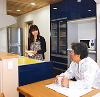 キッチンには仕事で忙しい奥様のこだわりがいっぱい。カップボードと家電収納カウンターは背面の凹みにすっきりと納め、アイランド型キッチンで動線もスムーズになり、ご夫婦の会話も弾みます。キッチンの奥には室内用昇降物干し竿を設置。水まわりにパソコンコーナーを設け、インターネットで調べ物やレシピを検索したりと大活躍です。新築時からヤマハのキッチンに憧れていた奥様は、ショールームに何度も足を運び、扉カラーは和のテイストにしっくり合った鉄紺色に決めました。マットな人造大理石の質感と扉の光沢が高級感をかもし出しています。「汚れが落としやすいからお掃除がしやすいです。本当に“私の為”のキッチンですね。」と大満足の奥様。