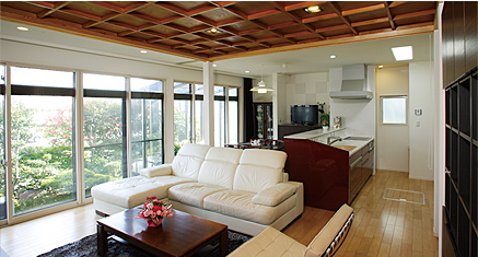 ワイドスパンの開口部の向こうは緑潤う美しい庭。