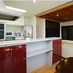 T様がどうしても残したかったもの、それは新築時に和室にしつらえたケヤキの格天井です。思い出が宿る宝物ゆえに普段ご家族の目に触れる場所に移築しようと、選んだ場所はリビングの天井。モダンなインテリアデザインと調和し、風格ある意匠が存在感を醸し出しています。手入れが行き届いた庭を背景にワイドスパンの窓を設置し、家事をしながら庭を眺められる位置にキッチンをレイアウト。「berry」との出会いを奥様は次のように振り返ります。「ショールームで真っ先に目に映ったのが、このディープレッドのキッチン。一歩先を行くデザインだけでなく、手元が隠れるステップ対面や野菜の保管場所に最適なサラットカーゴなど、主婦目線のアイディアが素晴らしいと思いました」。キッチンとカップボードの距離感が絶妙で、動きやすくなったのもポイント。さらに、ご主人がカウンターからダイニングテーブルへお料理や食器を運んでくれるようになったのもうれしい変化です。