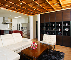 スタイリッシュなキッチンとモダンなインテリア、そこに風格のある格天井を同居させるのは至難の業でしたが、出来上がりはとても良い雰囲気となりました。リビングには天井に合わせて格子状の収納棚を造作し、“見せる収納”と“隠す収納”を使い分けました。また、キッチンの奥にはパントリーを設置。食品のストックや生活雑貨はまとめてここに収納し、LDKに生活感が漂わないよう配慮しています。