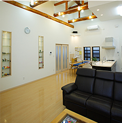 まず、家族が集うLDKは十分な広さと天井高を活かして開放感あふれる空間に。当初、吹抜けも検討しましたが、屋根を高くすると部屋が暗くなってしまうため、明るさを優先して部分的に梁を見せた天井を採用しました。窓の位置を工夫したり、天窓を設けて自然光をふんだんに取り入れ、壁と天井は白で統一。コーナーにあったキッチンを移動し、いつも家族の姿が視界に入るオープンキッチンに変更。既にヤマハ製品をご愛用の奥様は、人造大理石の質感がお気に入りで、ショールームに何度も足を運んでカラーを厳選されました。キッチンの扉色は、上品な栗皮色を選択され、白い壁と明るいフロアに映え、絶妙なコントラストで空間を引き締めています。また、照明にもこだわり、梁に灯りを取り付けたり、ダウンライトを採用し温もりとやさしさを演出。シーンによって使い分け、同じ空間でも多彩な表情を楽しむことができます。