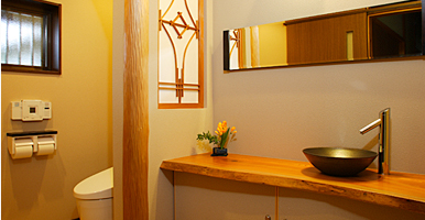 水まわりは使いやすさとお手入れのしやすさを追求する一方で、デザイン性にもこだわりました。注目すべきはまるで高級旅館のようなトイレ。解体時に出た廃材を再利用して間仕切りの床柱と飾り障子をしつらえ、和の趣が漂う素敵な空間に仕上げています。また、洗面室には人造大理石カウンターをオリジナルで造作。左右の大きな鏡に取り付けた間接照明がやわらかな灯りを放つとともに、背面には大容量の収納棚を設置し、洗面カウンターがいつもきれいに片付くよう工夫しています。浴室にはヤマハのBeaut PREMIOを採用。「ミストサウナでリラックスするバスタイムが楽しみ」と奥様はご満足の様子です。