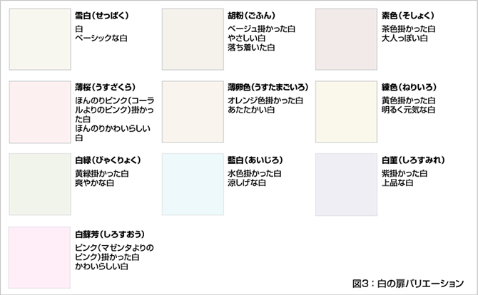例えば、ここ数年人気がある白いキッチンでは、「雪白(せっぱく)」「胡粉(ごふん)」「素色(そしょく)」「薄桜(うすざくら)」「薄卵色(うすたまごいろ)」「練色(ねりいろ)」「白緑(びゃくりょく)」「藍白(あいじろ)」「白菫(しろすみれ)」「白蘇芳(しろすおう)」といった微妙な色合いを、熟練の職人の手によって表現。白だけでも、色の系統や明るさが異なる10色からお客様のイメージに合せてお選びいただくことが可能になりました。(図3)