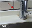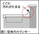 従来の手元が隠れるタイプの対面キッチンでは、カウンターと壁(キッチンパネル)の継ぎ目にコーキングが施されているため、コーキング部分に汚れが付着しやすく、さらに継ぎ目は凹凸があるのでお手入れしにくくなっており、どうしても汚れが溜まりやすくなっていました。(図1、写真3)