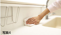 Toclas Kitchenのステップ対面プランでは、カウンターと同じ人造大理石のバックガードを笠木カウンターまで立ち上げ、コーキングを無くした凹凸のないなめらかな形状にすることで清掃性を高めました。またバックガードに汚れがついても、ヤマハの人造大理石は汚れが染み込みにくいため水拭きするだけで汚れを落とすことができ、毎日のお掃除が一段と簡単になります。(図2、写真4)