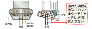 ヤマハのC(サイクロン)フードは1998年の発売以来、独自の水平渦巻き捕集による高い集煙能力と、煙をキャッチする小型フィルターのお掃除しやすさで、お客様から高い評価を頂いております。
