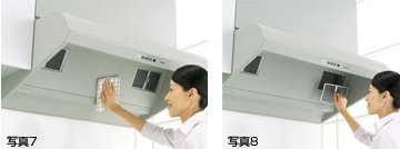 煙をフロントでキャッチする方式なので、日常のお掃除は外側の案内板の水拭きとフィルターの水洗いだけ。フィルターは親水性塗装を施してあるので、ぬるま湯につければ汚れが浮き上がります。さらに、大きさも従来比55%に小型化したので、取り外しやすくお手入れ簡単です。(写真7,8)