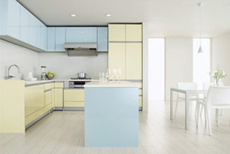 写真セット価格 ■キッチン部 : 税込3,394,335円 ■アイランド部 : 税込878,535円 間口 キッチン部:2550mm×3000mm アイランド部:1500mm 扉 シャインカラー/鳥の子色(とりのこいろ)・淡水色(うすみずいろ) (ブルモーションレール仕様)