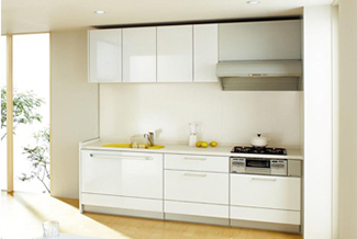 写真セット価格 ■キッチン部 : 税込1,103,760円 間口 キッチン部:2550mm 扉 Aシリーズ/ミルクホワイト (標準レール仕様) ◆T型キッチン 標準プラン