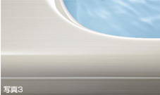 バスルームの主役はバスタブである、という考えに基づき、外観は普遍的なストレート形状でありながら、内部には体を包み込むようにフィットする曲線を用いた「ブロッコバス」という新しいバスタブデザインをGK Designとのコラボレーションにより提案いたします。(写真1、2) 素材にはヤマハ独自の人造大理石を用い、なめらかな素材感と体になじむやわらかでやさしい形状にこだわりました。あたかも石の塊を彫り込んだ中に身をゆだねるような感覚で、入浴本来の安らぎを提供し、入浴の満足感を高めます。