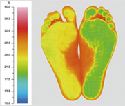 表面温度5℃の床材に15 秒立った足の裏のサーモグラフ。従来品(右)と、やわらぐフロア(左)では約5℃ の違いがあります。