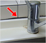 従来のキッチン。つなぎ目のコーキング部に汚れがたまる。