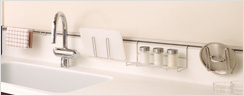 バックガードの高さを利用して、まな板や鍋蓋の水切り、小物置きなどに使用できる、付属のハンガーアイテム。シンプルなI型キッチンの利便性を向上させます。