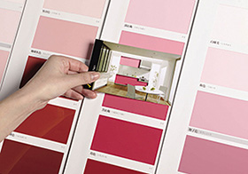「シャインカラー」114色のキッチン扉は、シミュレーションカードと実際の扉サンプルを組み合わせて空間イメージを確認できます。