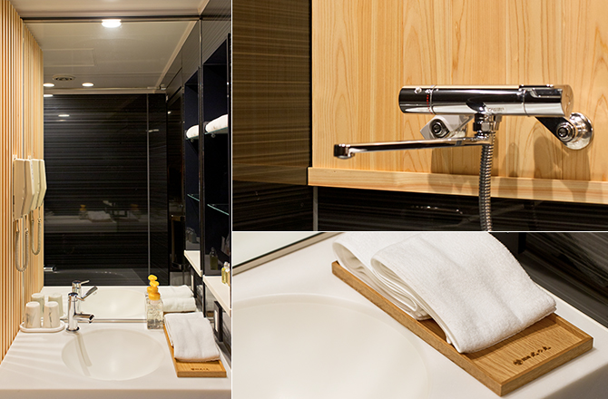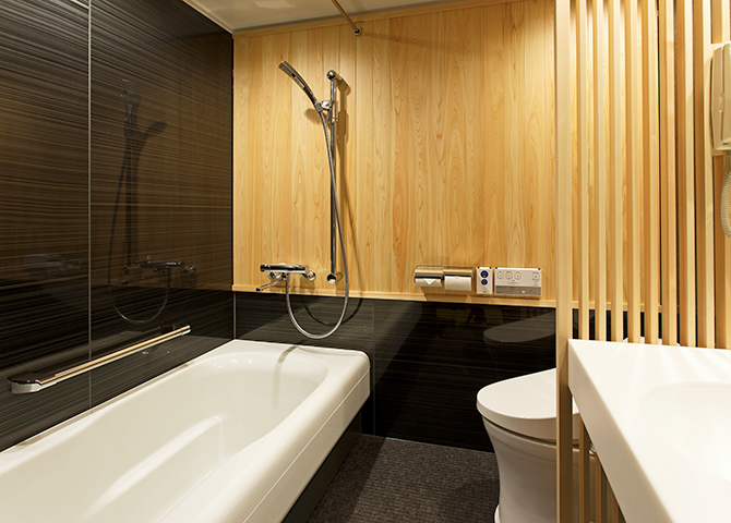 居室性を追求し、ユニットバスルームではあまり用いられない天然のヒノキを、バスルーム壁面や間仕切りに採用。さりげなくトイレを隠したレイアウトでありながら、間仕切りは格子状にすることで、空間の圧迫感を抑えました。また、鏡や黒の鏡面壁を効果的に用いることで、空間を広く見せる工夫も凝らしています。