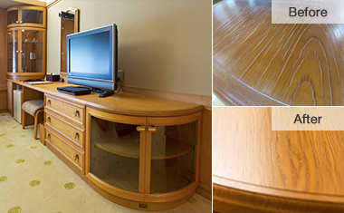 家具の天板化粧板が、全体的に割れていたものを、トクラスの木工技術で補修。様々な樹種で製造された家具についても、1点ずつ経年でできた風合いと木の特性を残しながら、修理、塗装を行いました。