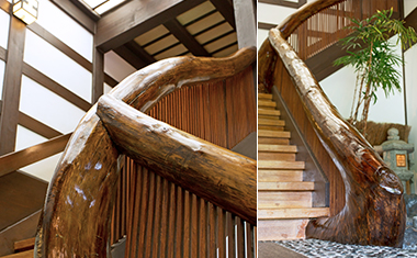 宿泊客を出迎える大階段は、北の丸の象徴の1つ。その手すりは、郡上八幡の雪の重みで倒れ再び起き上がった松をそのまま活かしています。