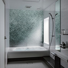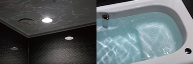 従来に比べ光の拡散を抑えることで演出効果を高めた照明「みなもライト」を搭載。水面の柔らかな光のゆらぎが天井に映し出され、また、風景をモチーフにしたデザインの壁には陰影が生まれる照明設計で、限られた浴室空間でも表情の変化を愉しめます。
