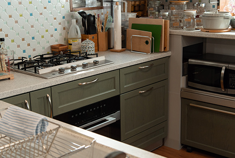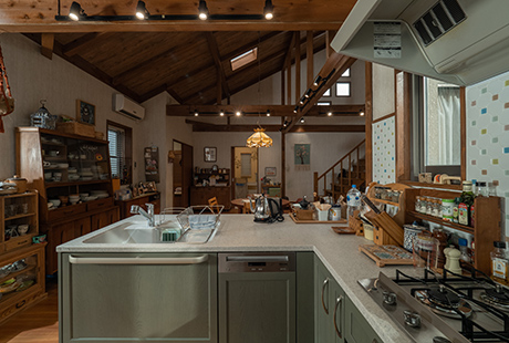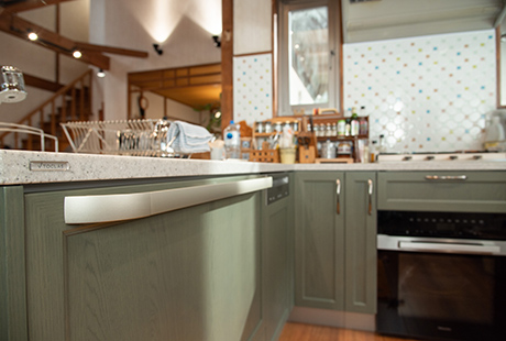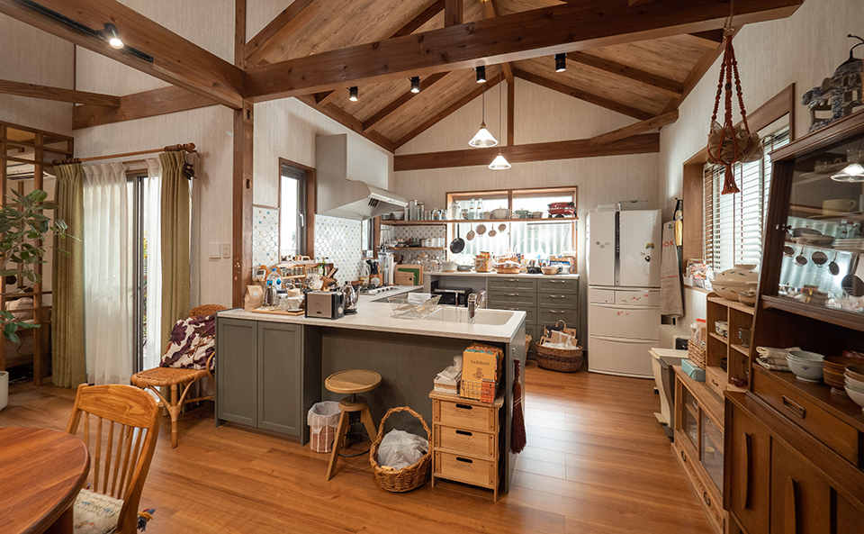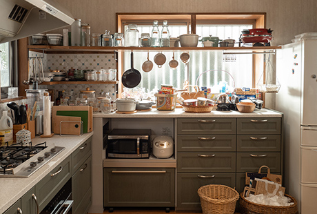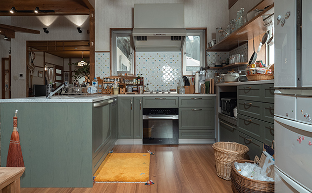 「ホワイト系や木目扉など、様々な扉を検討しましたが、グリーンの框扉が木を基調とした温かみあふれる家にマッチすると思いこのキッチンに決めました。貴恵が料理上手ということもあり、細かいレイアウトにもこだわり、広さと収納力を兼ね備えたものを選びました。」