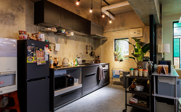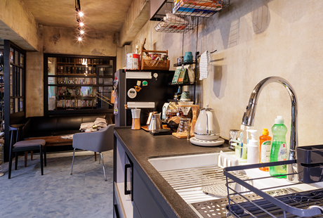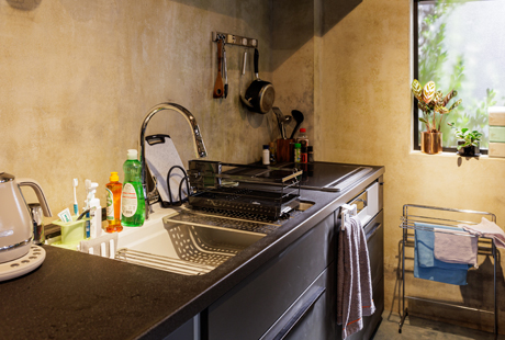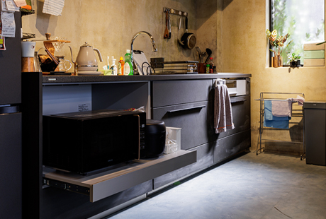 また、コンクリート調の内装材やインテリア小物との調和を意識して、「TENOR(テノール)」カウンターのメテオダークグレーと、塗装扉「リュッケファーブ」のダークグレーを採用。トクラス独自の塗装技術により実現した、柔らかでマットな質感がスタイリッシュな空間を引き立てます。